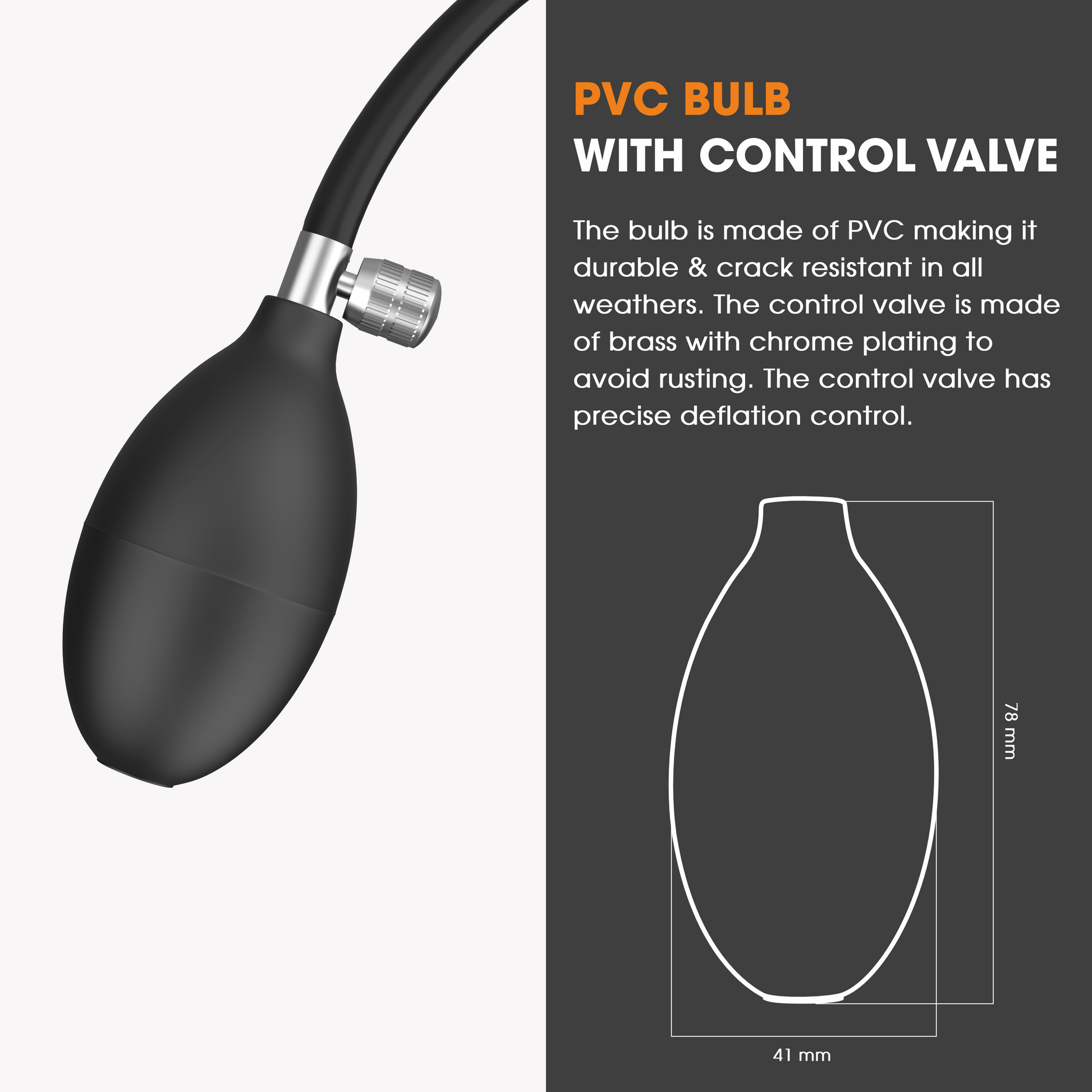 The inflation bulb is made of rubber and is crack resistant and non sticking The air release valve is chrome plated to avoid corrosion. The device has a dual-tube bladder for an efficient air release bullet-point